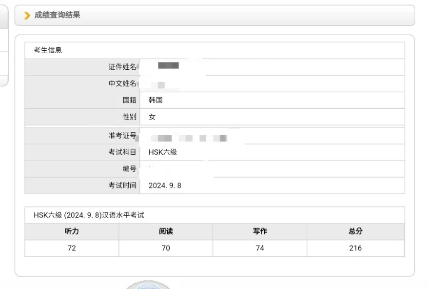 [출석or성적] HSK 6급 합격보장 200% 환급반 합격 후기 (210점 이상)